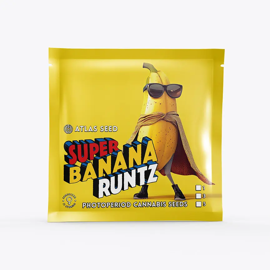 Atlas Seed Super Banana Runtz cannabis seeds produce frosty buds with banana and candy flavors. Feminized, mold-resistant, they finish in 63-70 days. Ideal for all growers, these seeds yield big with ease. Order from Luscious Genetics now!