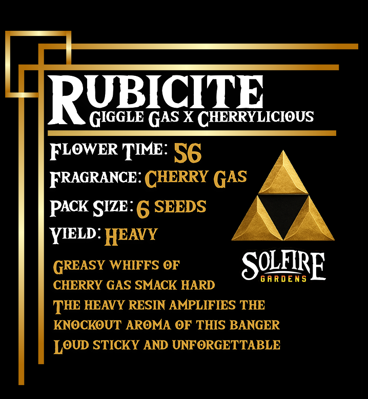 Solfire Gardens Rubicite feminized seeds smack loud in 56 days. Giggle Gas x Cherrylicious drops greasy cherry gas terps, knockout aroma, heavy sticky colas—6 seeds of unforgettable PNW heat!