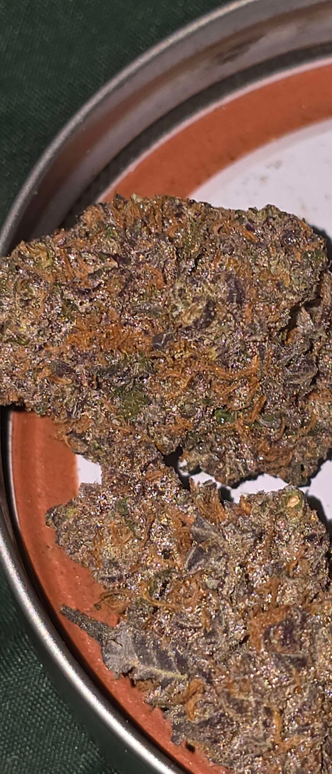 Trichome Bros Fiji Sunset Frost, Coco Chanel × Mango Madness. Dark purple buds with bright orange hairs, watermelon-grape candy + tropical gas.