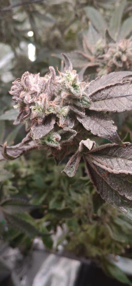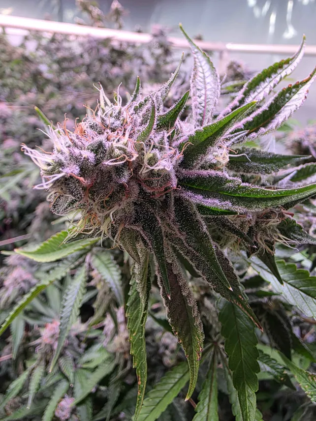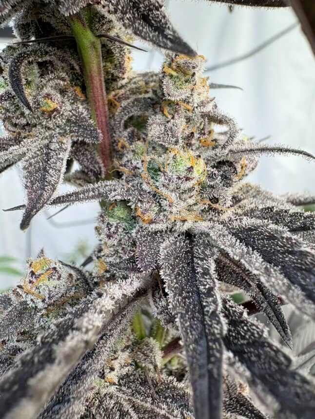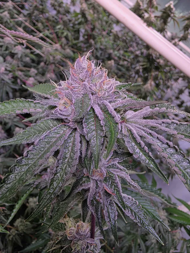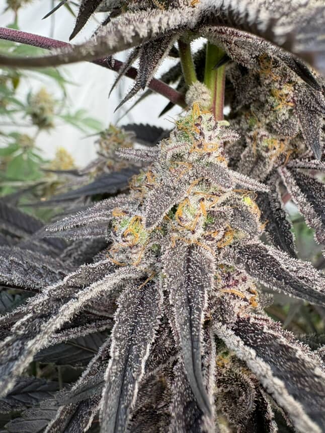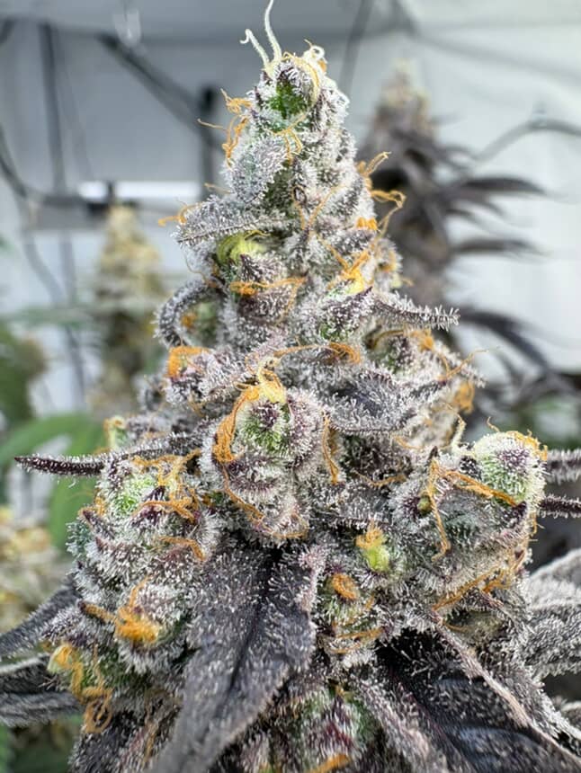 Growers are pulling absolute beasts — plants double the size of everything else, stretch hard, and finish in gorgeous royal purple. Cone-shaped colas are rock-hard and drenched head-to-toe in sticky trichomes. Real-world: 14.5 oz from one plant on just 4 weeks veg indoors.